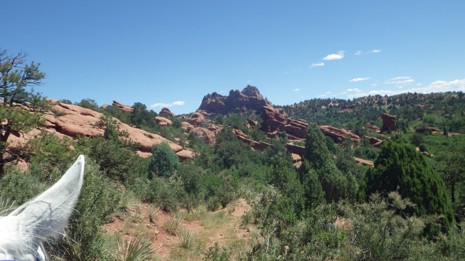So, this was an interesting part of the trail. The trail went behind the big tree to the left, next to the two pillars just left of center. The approach was up slick rock and had a small saddle between the pillar an another rock (which is hidden by the tree). I got off and told K that I didn't think it was rideable. The saddle was about three feet wide with a drop off of 2 and a half feet to a ledge, and then another step off about a 2 foot ledge to solid ground. K thought she would ride it until she got to the saddle and then she got off. Eddy was a rockstar and didn't move a hoof waiting for her. We called him Eddy VanHalen after that.
